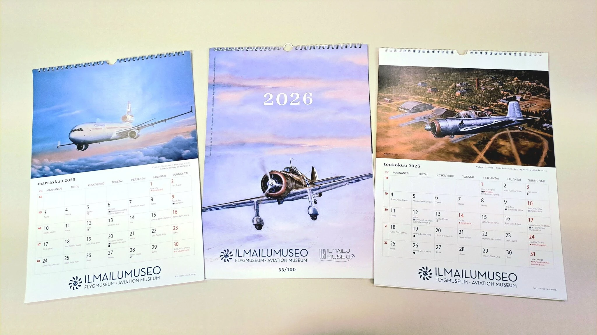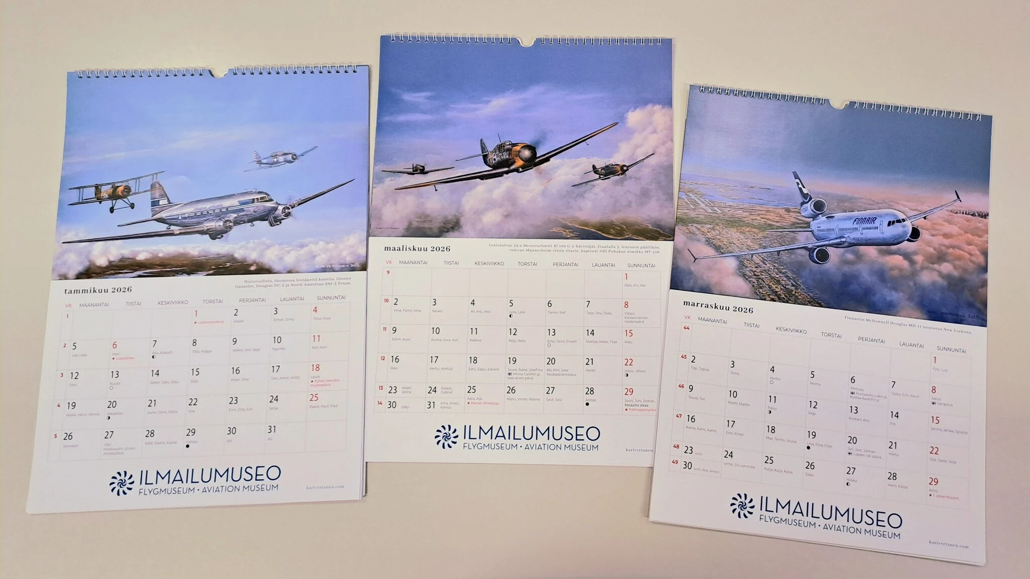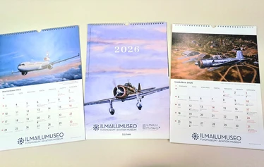 Ilmailumuseon seinäkalenterin kuvituksena on ilmailutaiteilija Kari Vertasen maalauksia niin siivili- kuin sotilaslentokoneistakin. Kalenteri alkaa jo marraskuusta 2025, eli upeita kuvia on tavallisen 12 sijaan kokonaiset 14.