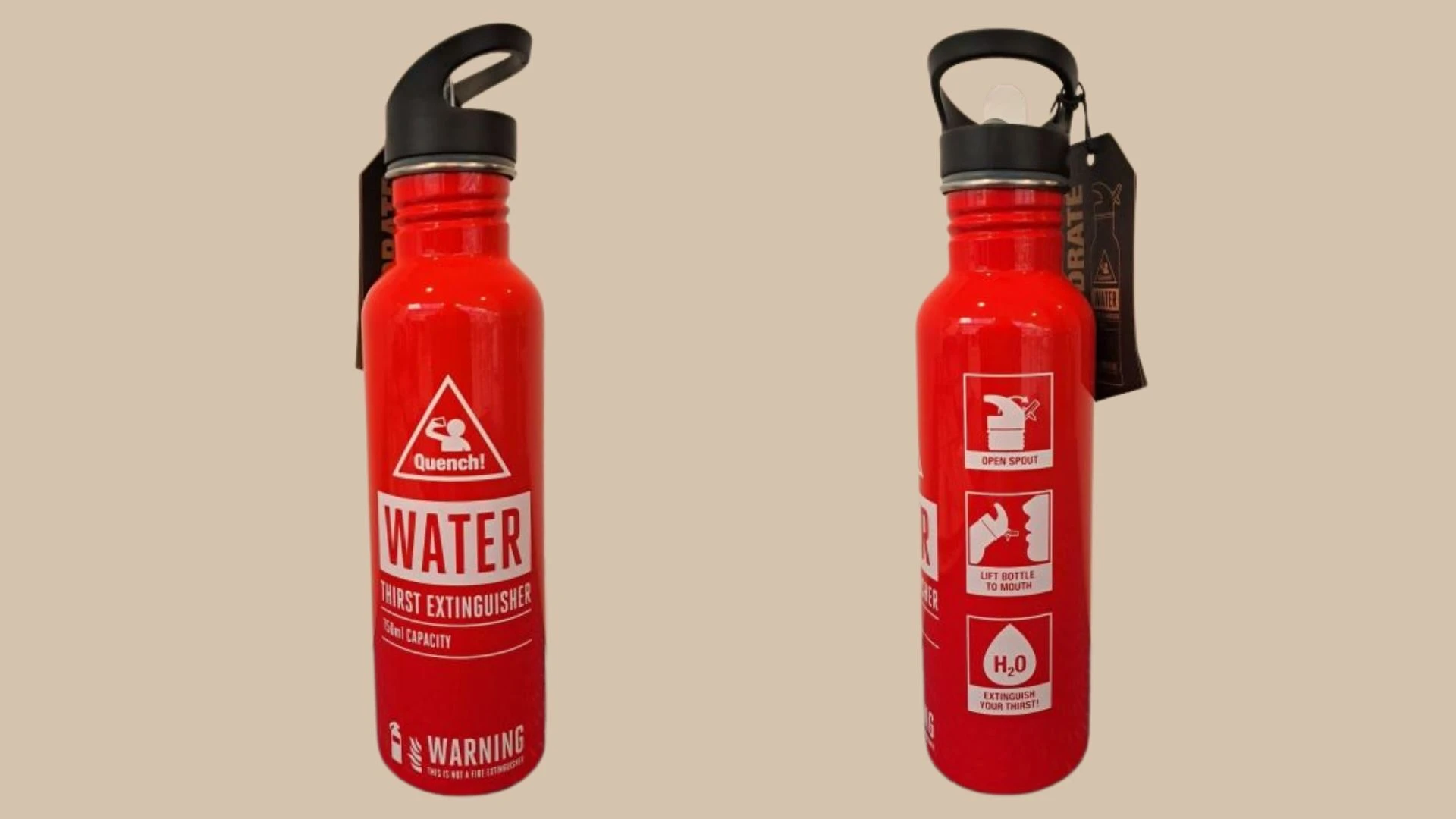 Sammuta janosi tyylillä! Janonsammutin-juomapullo muistuttaa aitoa käsisammutinta.