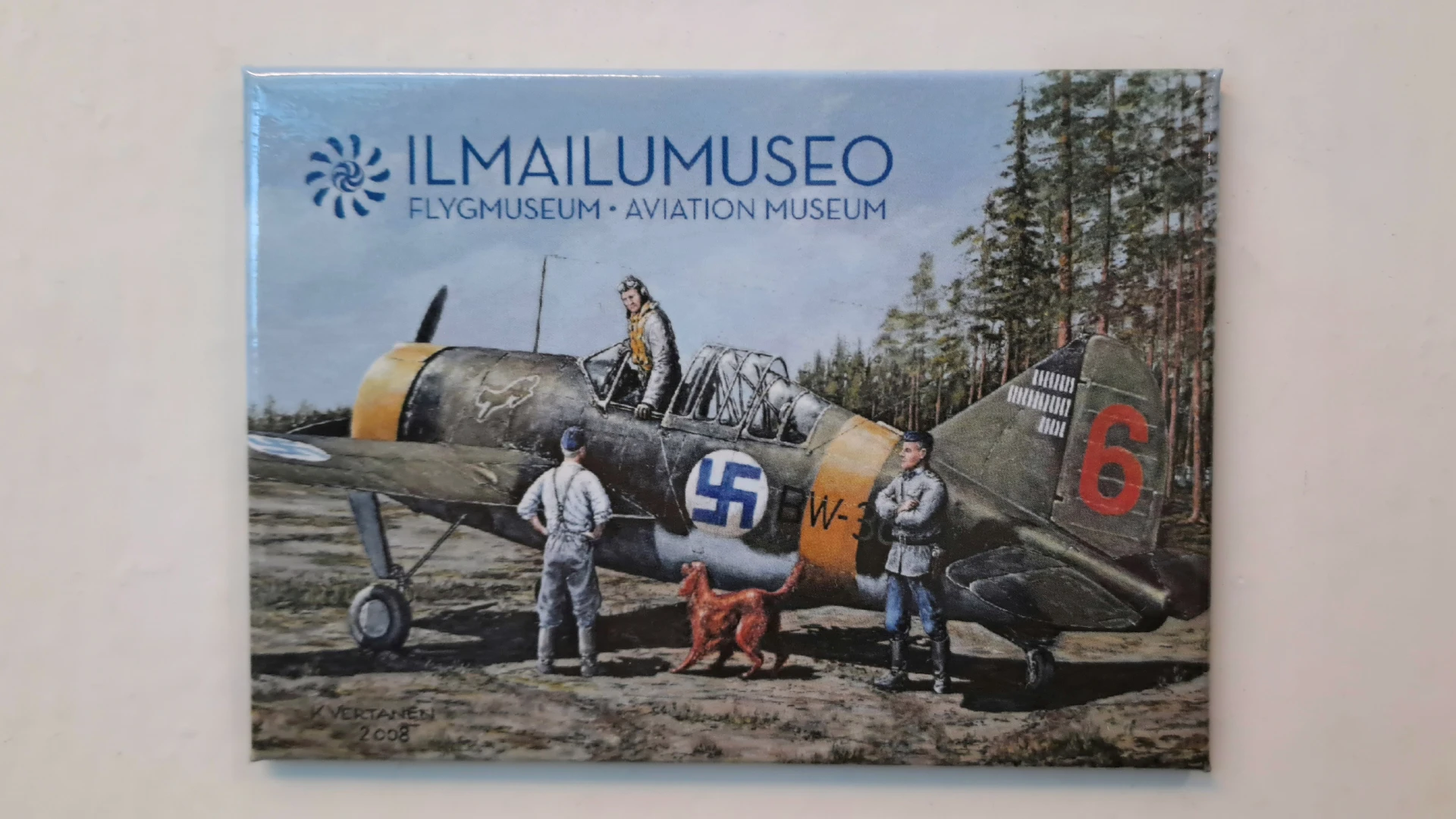 Ilmailuaiheisen magneetin kuvituksena on Lentolaivue 24:n Brewster B-239 BW-366.