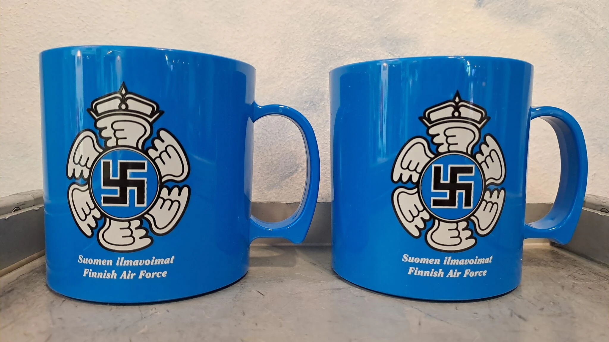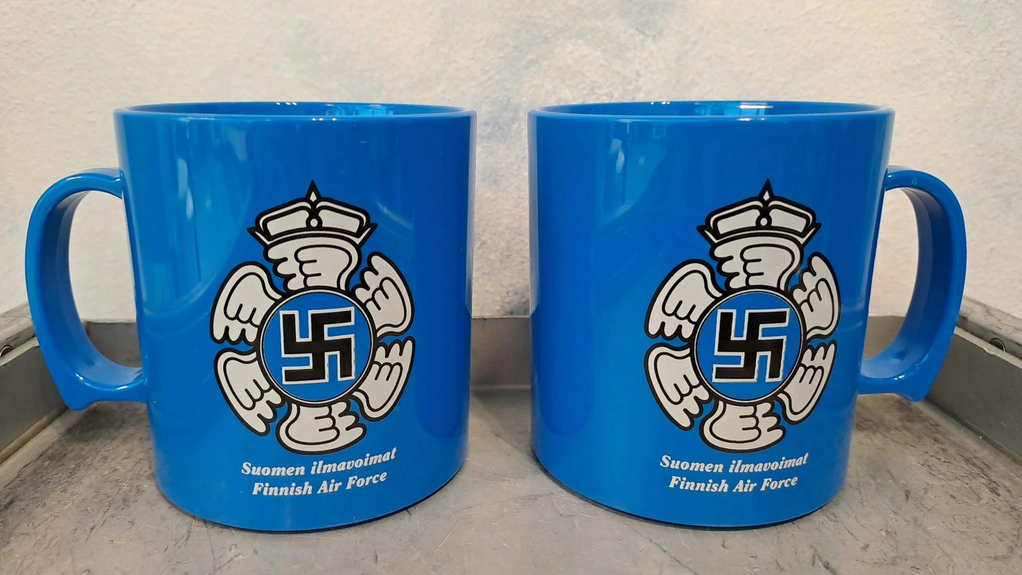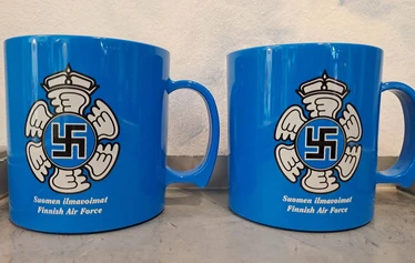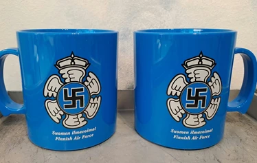 Suomen Ilmavoimien hakaristilentomerkki kuvittaa mukia molemmin puolin. Tukeva muki on mukavasti muotoiltu ja kestää hyvin käytössä. Mukin tilavuus on 3,5 dl.