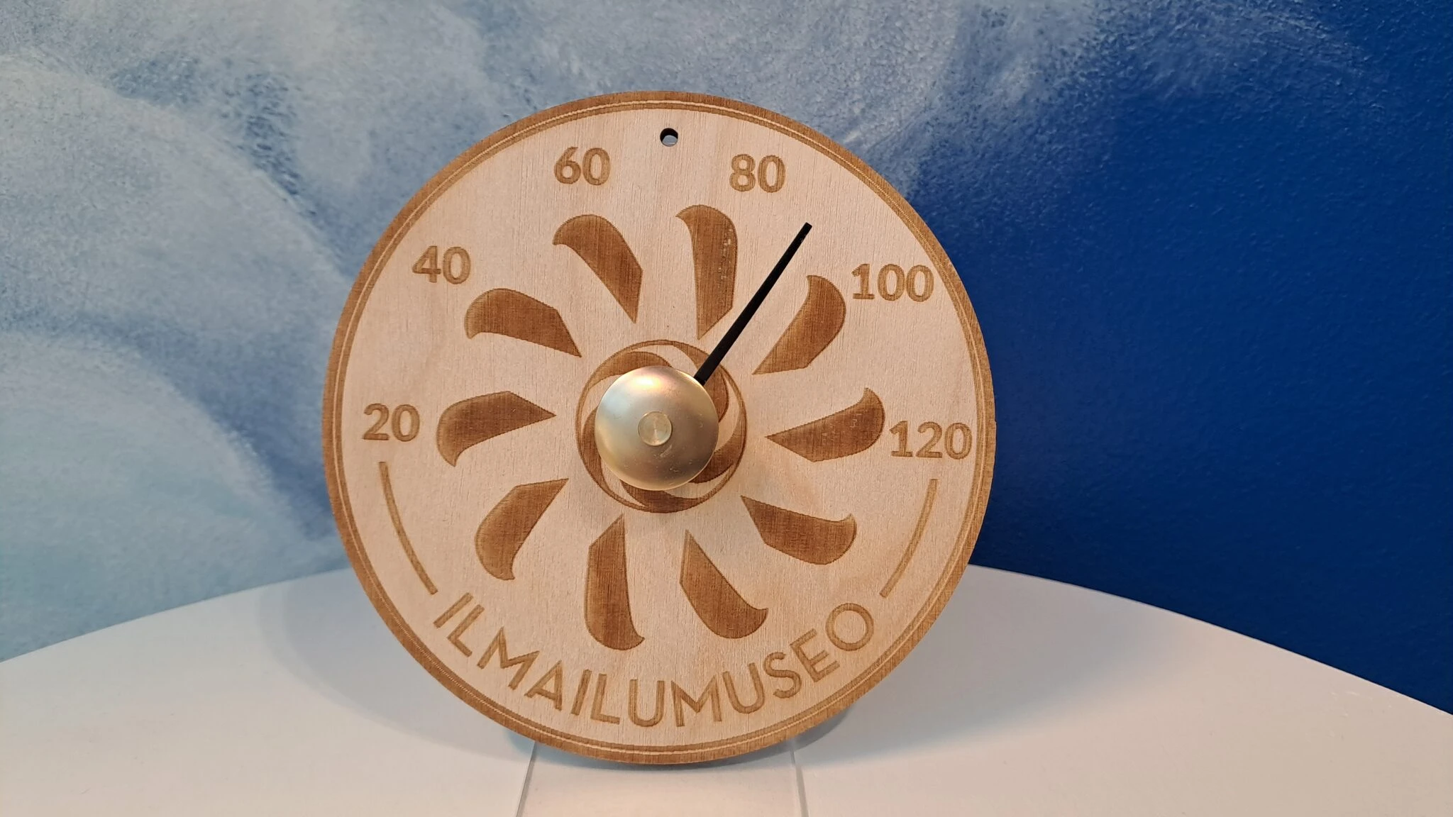 Löylymittaria koristaa Suomen Ilmailumuseon pitkäaikainen, propellimainen logo. Upea mittari on tehty suomalaisesta koivuvanerista ja se toimitetaan kätevässä lahjalaatikossa. Pakkaus sisältää naulan mittarin kiinnitystä varten.