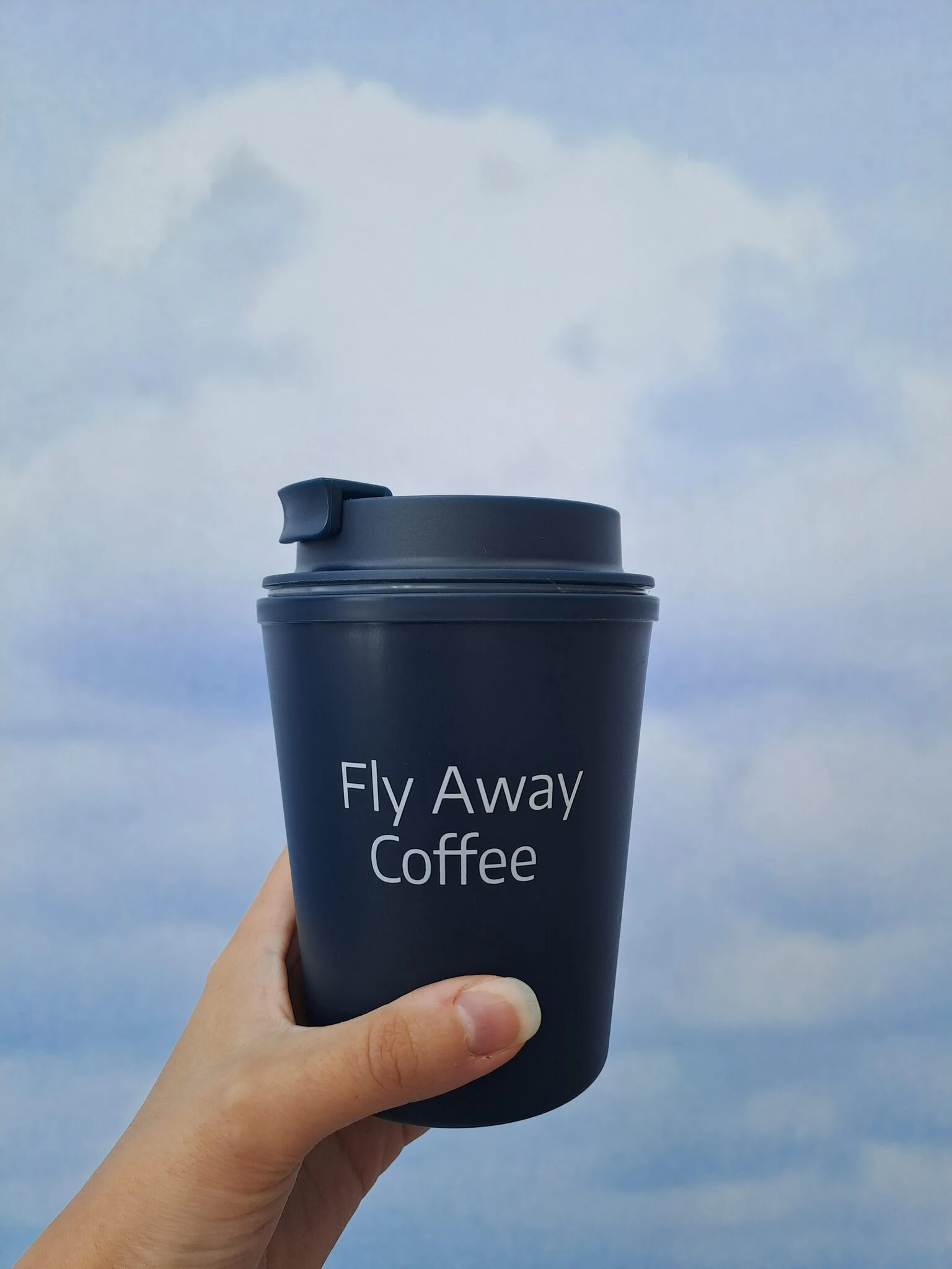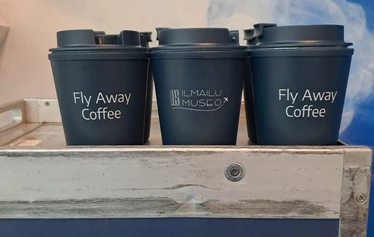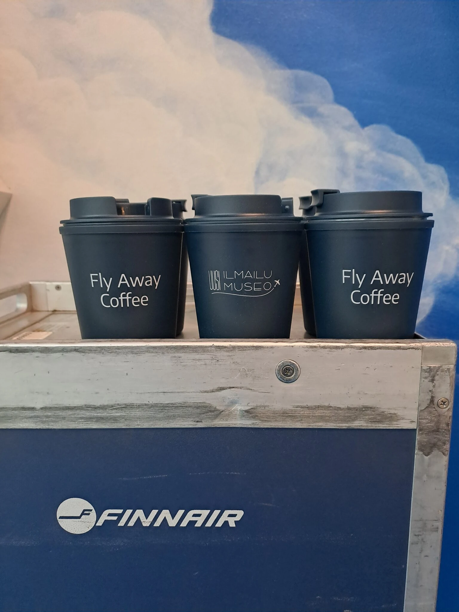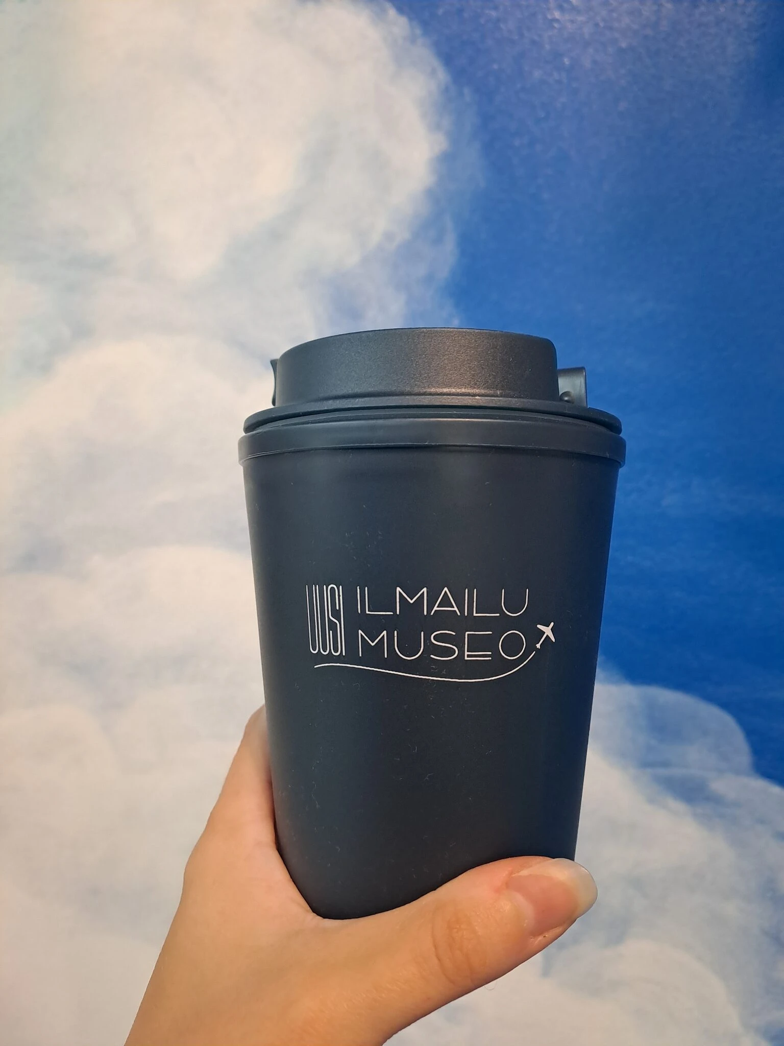 Ilmailumuseon uniikkia takeaway-mukia koristavat lentävä lause ”Fly Away Coffee” ja Uusi Ilmailumuseo -logo. Mukiin mahtuu mukavasti 3 dl juotavaa, joka pysyy pidempään lämpimänä kaksinkertaisten seinämien ansiosta. Muki on kätevästi konepestävä ja materiaalina on kierrätetty polypropeeni. Muki on väriltään tyylikäs tummansininen.