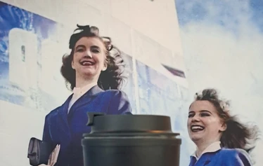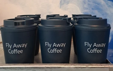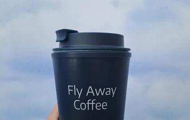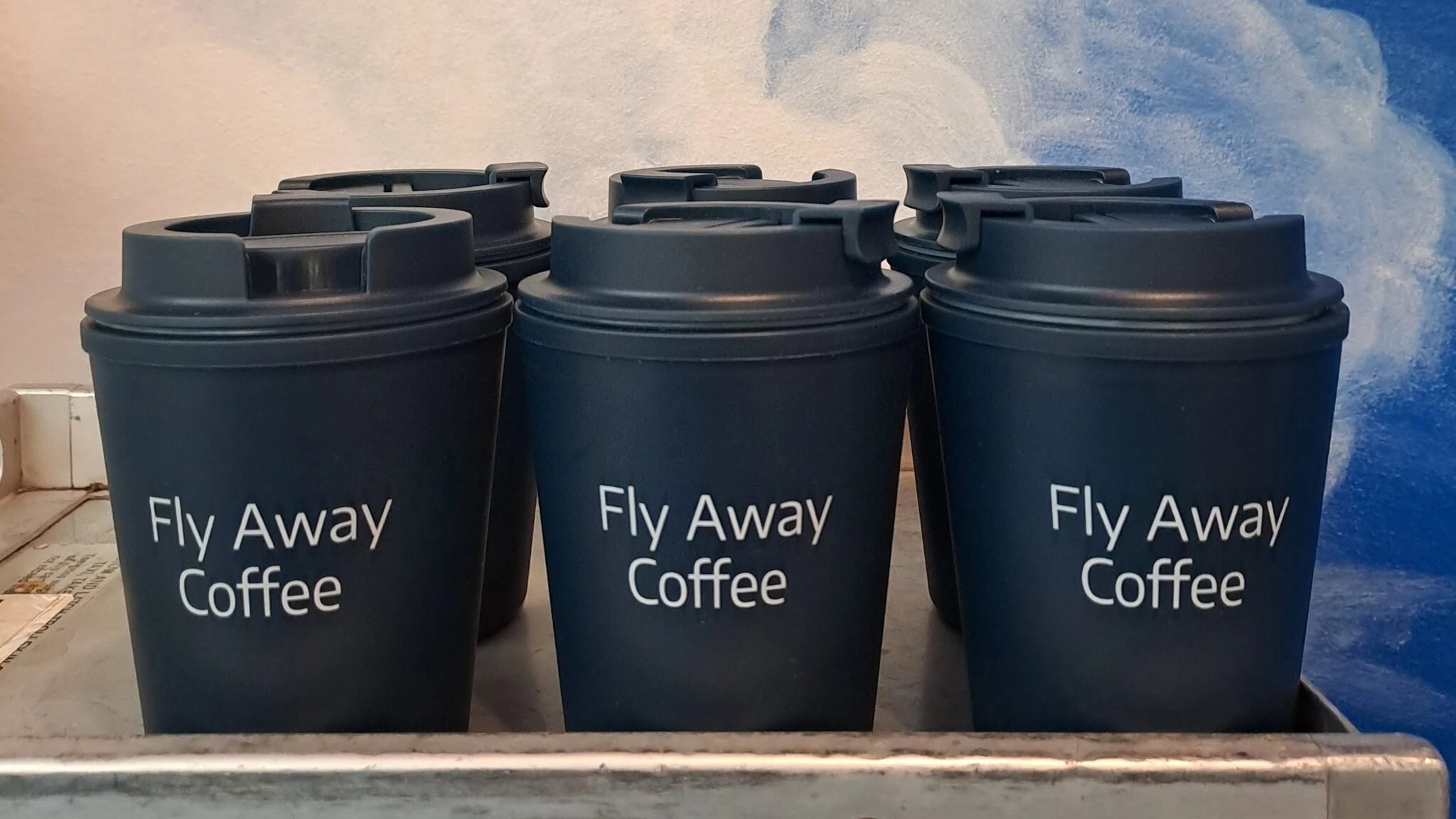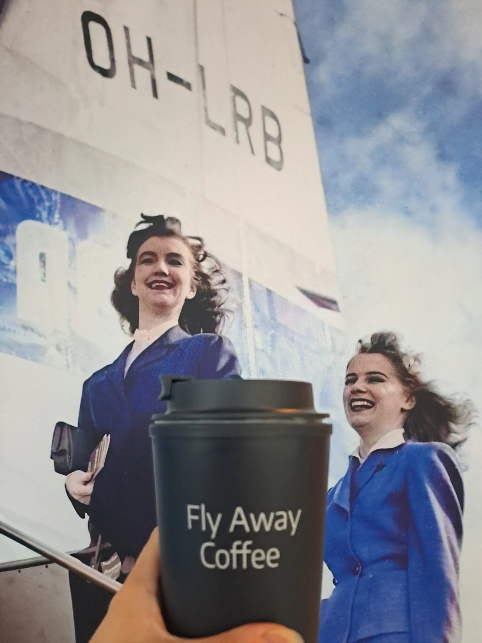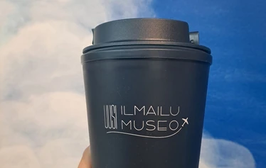 Ilmailumuseon uniikkia takeaway-mukia koristavat lentävä lause ”Fly Away Coffee” ja Uusi Ilmailumuseo -logo. Mukiin mahtuu mukavasti 3 dl juotavaa, joka pysyy pidempään lämpimänä kaksinkertaisten seinämien ansiosta. Muki on kätevästi konepestävä ja materiaalina on kierrätetty polypropeeni. Muki on väriltään tyylikäs tummansininen.